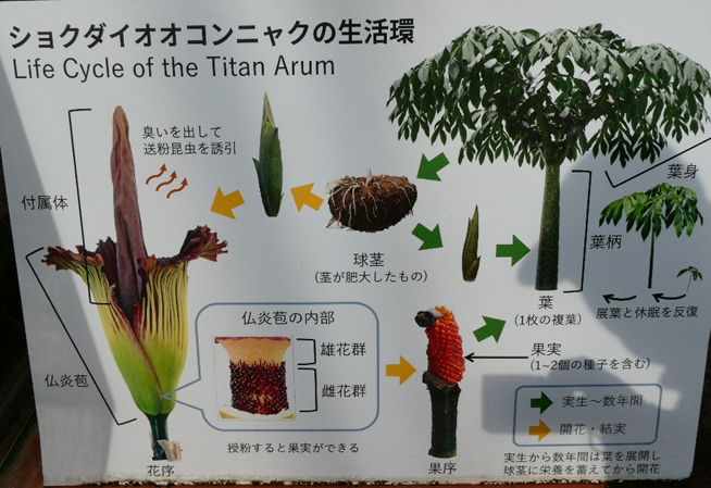 インドネシアのスマトラ島原産で、世界最大の花として、また、世界一臭い花としてギネス認定されているという「ショクダイオオコンニャク」について説明を聞きました。1991年11月18日に小石川植物園にて、日本初となる開花を観察したとのことでした。