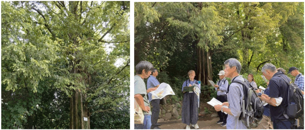 まずは、正門近くの巨大なメタセコイアの説明からスタートしました。1941年に化石標本から発見されたメタセコイアは、1945年に中国四川省で野生種が発見された経緯から生きた化石と呼ばれていて、日本には1949年10月に米国から贈られた苗木を小石川植物園で生育し、現在では日本各地に植えられているとのことでした。