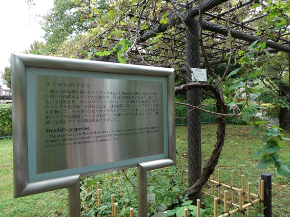次に、メンデルのブドウを観察しました。これは、遺伝学の基礎を築いたメンデル(Gregor J. Mendel)が実験に使ったブドウの分株で1914年にチェコスロバキアから送られてきた種で「メンデル葡萄」と呼ばれているそうです。