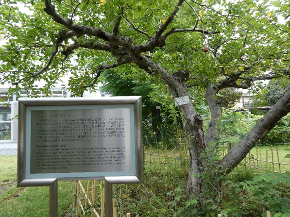 続いて、「ニュートンのリンゴ」について説明を受けました。リンゴが木から落ちる様子を見てニュートン(Isaac Newton)が万有引力の法則を発見したという有名な逸話の木を接木によって英国や米国などに分譲したそうで、日本には1964年に英国から贈られてきた木を小石川植物園にて接木し、生育したとのことでした。