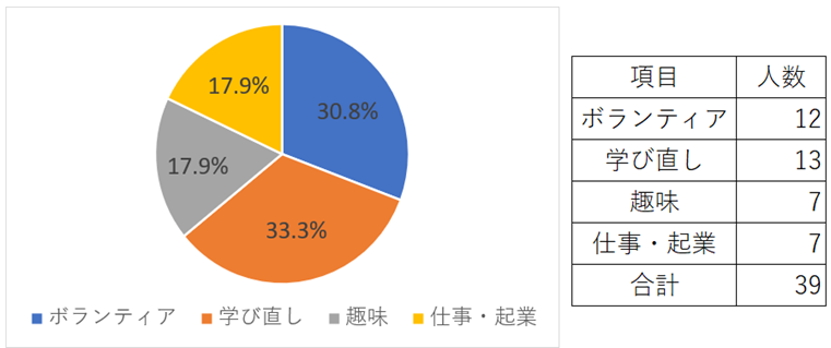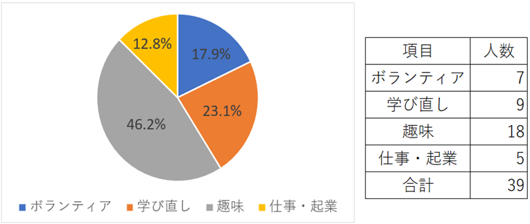 受講申込時に「プレミアム・カレッジ修了後の活動に関して関心があること(図2、図3参照)」を受講者にお聞きして、同じ関心を持つ人を5~6名のグループ分けを行った。そして、各グループで「これからどんなことをやってみたいか」をテーマにディスカッションして貰い、その結果を各グループに発表して頂きました。