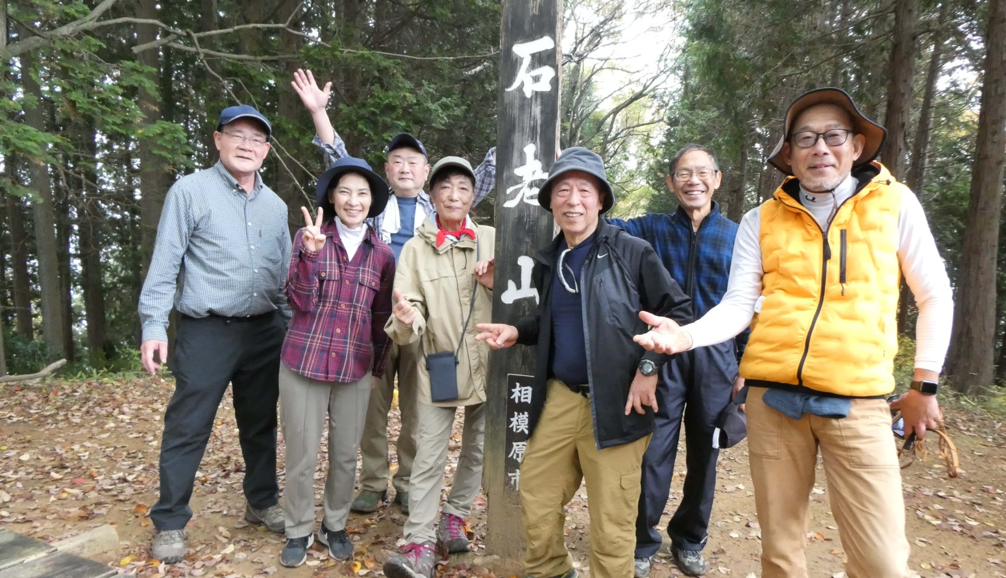 当日11月10日は前日の冷たい雨から一転してハイキングに最適な朝を迎えることができました。JR横浜線でポイント点検による遅延があったものの、集合時間前には参加者7名(男性5名、女性2名、一期2名、二期3名、三・四期1名ずつ)全員が相模湖観光案内所に集まり、熊出没情報や対策等を確認の上、JR相模湖駅から9時1分発のバスで石老山入口に到着、登山を開始しました。