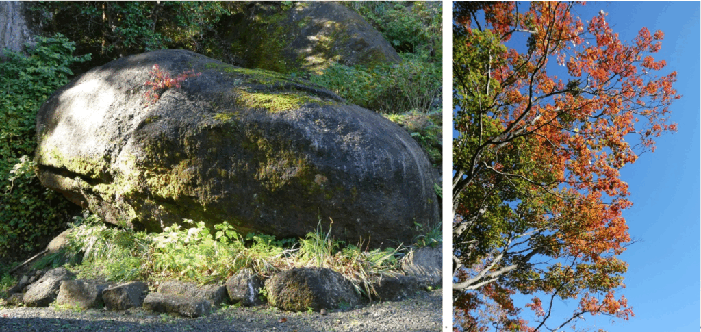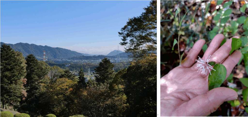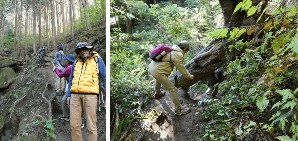雨上がりのハイキング。秋の森林浴と紅葉、山頂からの富士山眺望が楽しみでした。階段の段差、杉の木の根張り、岩石がゴロゴロ、そして落ち葉の敷き詰まった多様な山道。足を滑らせないよう、全身汗まみれになった自分がそこにいました。山頂で見た杉の葉が吹雪のように舞い落ちる光景は幻想的でした。また苔むした岩たちの美しさに癒されました。ただ、途中で出くわした難所。上り坂で倒木が横たわり、人一人が這って通れる隙間しかなく、人の手を借りて潜り抜けた至難の業が印象的でした。