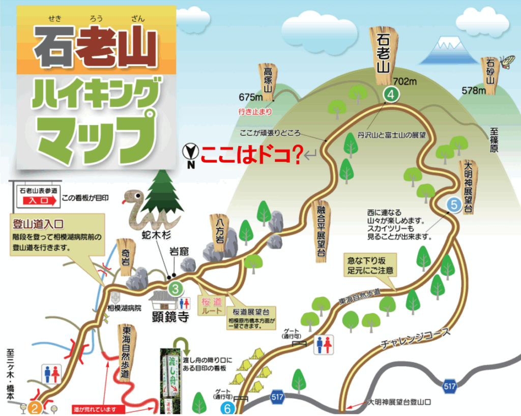 相模湖観光案内所で頂戴した「石老山ハイキングマップ」に一か所「ここが頑張りどころ」と記されている箇所が実は何か所もあるのではないかと疑いつつ、やっと到着した山頂ですが、ちょうど雲がかかったタイミングで丹沢や富士山が瞬間的にしか見えません。残念がる我々がうるさかったのか、先に登頂されていた日本語が流暢な外国人カップルから我々が到着する前に撮影した写真をみせてもらったり、ソロ登山の方から親切に見える場所を教えてもらったりして、こうした交流も楽しいものです。記念写真を撮り、軽食をとって束の間の休息を満喫しました。