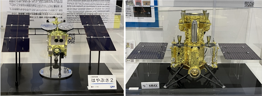 「はやぶさ2」模型(左)、MMX火星衛星探査機模型(右)
