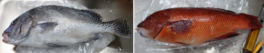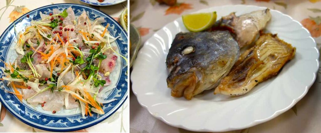 さらに、当日の朝に市場で仕入れた「コショウダイとブダイのカルパッチョ」は鮮度抜群。兜とカマの塩焼きは、存在感を放っていました。