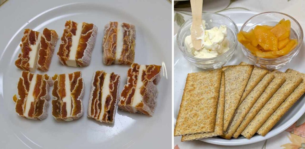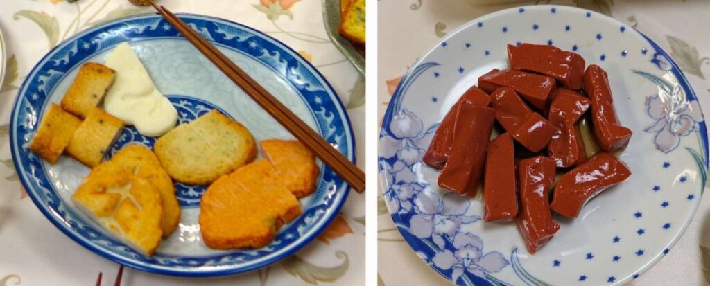 市田柿のミルフィーユ、かりんとクリームチーズのカナッペ、鈴廣のさつま揚げ、近江の赤こんにゃくが並びます。