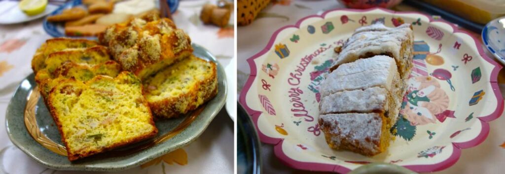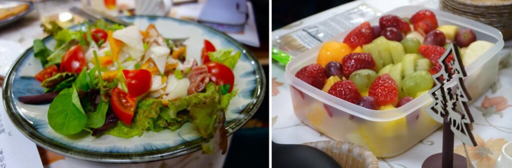 締めには、柿・蕪・生ハムの冬らしいサラダ、色鮮やかなカットフルーツ、そしてケークサレ、シュトーレンが登場。