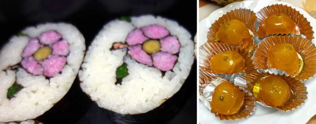 早春を思わせる「桃の花の飾り花寿し」、そして「金柑の甘煮」は、冬の香りと優しい甘さが広がる正月の小鉢として