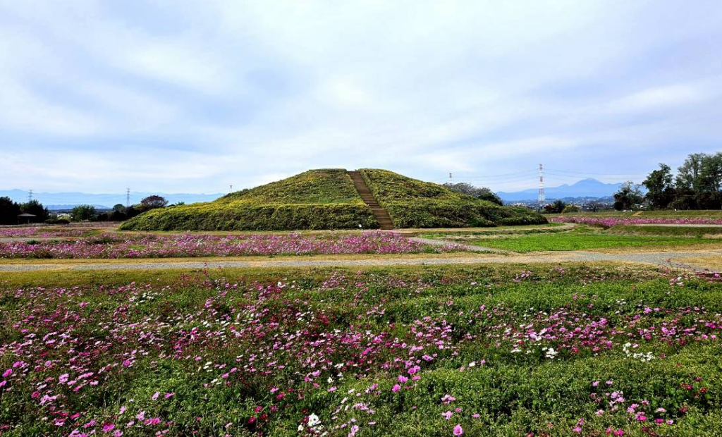 二子山古墳は墳丘長108mの前方後円墳で周囲に内堀と外堀を巡らせ、総長は213mになります。ちょうどこの季節、内濠と外濠にはコスモスが咲き乱れていました。この古墳の特徴としては、祭祀に使用されたと推定されている内堀に作られた4つの円形の中島があることです。後円部墳頂では2基の埋葬施設が見つかり、このうち舟形石棺からは玉類や武具、馬具、農工具などの破片が出土しています。