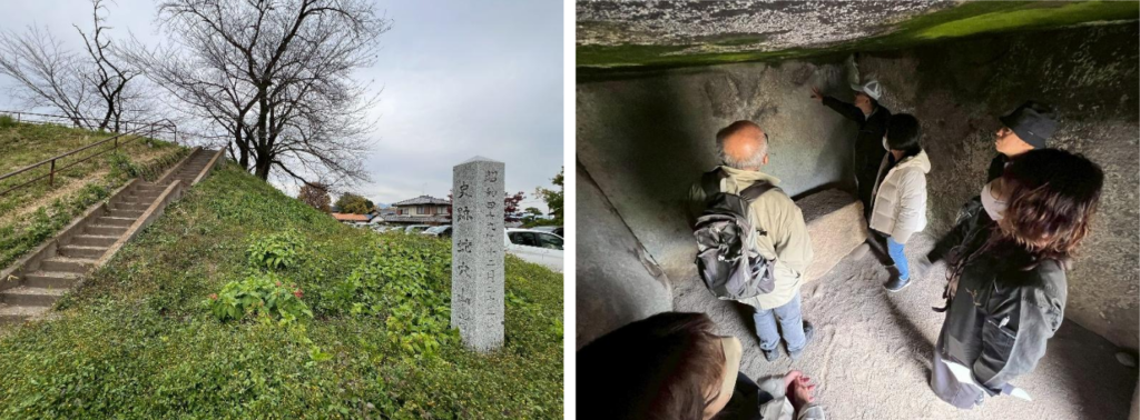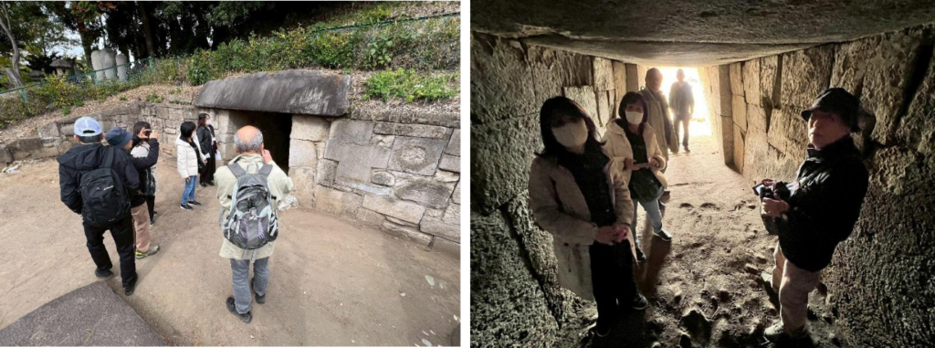 次に、宝塔山古墳に隣接するの蛇穴山古墳へ移動しました。古墳名は石室奥壁に江戸時代に刻まれた蛇の図があることに由来しているとのこと。宝塔山古墳と同じく方形墳で、一辺44m、高さ5mとやや小ぶりな古墳です。横穴式石室は、截石切組積みによって整美に構築されていて、玄室・前庭部のみの構成になっています。