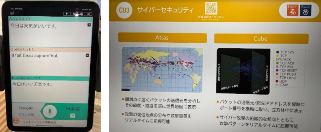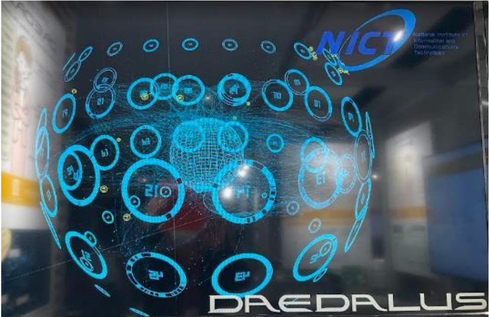 情報通信研究機構は初めて知る組織でした。日本標準時を定めるという私たちの生活に欠かせない役割のほかにも、研究範囲は多岐にわたり、どれも興味深いものばかりでした。特に目を引かれたのはサイバーセキュリティの分野で、「大規模ダークネット観測網を用いて検知されたサイバー攻撃と思われるアクセスをリアルタイムで可視化するシステムです」など、説明してくださる方の用いる単語を聞いているだけで最先端を経験するワクワクがありましたし、対サイバー攻撃アラートシステム(DAEDALUS)のグッドデザイン賞を受賞したという動画は見飽きませんでした。機会を見つけてまた訪ねたいと思います。