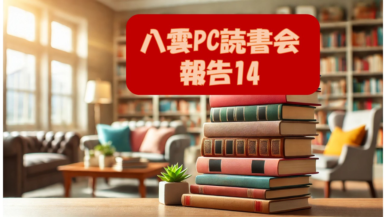 本を一冊紹介すると、話題は本棚から飛び出して、家庭、社会、歴史、身体、そして未来へと広がる。第14回も例外ではなく、Z世代の親子関係から酵素、沖縄の自然、細胞の都市、言葉のパンチライン、監視社会、そして人生100年の設計図まで、まるで“知の乗り換え案内”のような回となりました。次回・次々回も、読んで、話して、笑って、少し考えて、最後はだいたい仲良く散会(時々そのまま飲み会)——八雲PC読書会は続きます。