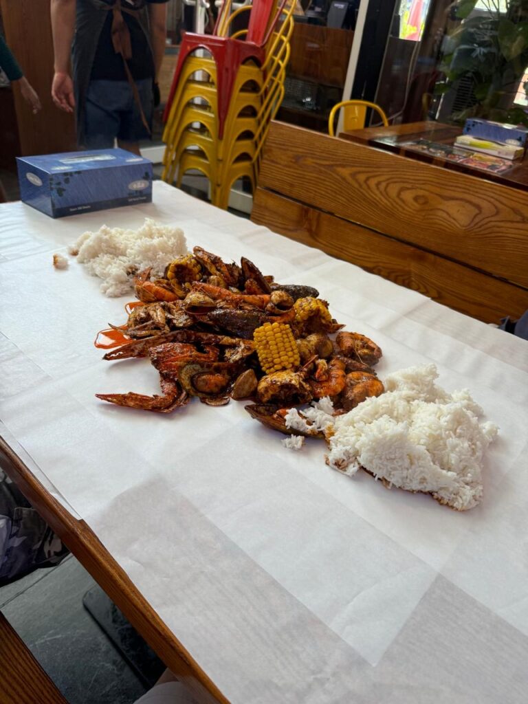 写真は、ドバイのシーフードレストランで実際に食した際のものです。ここではシートを敷いたテーブルの上に料理がどさっと盛られ、ビニール手袋を着用するスタイルでした。確かに、この野性味のある食べ方は自然と和気あいあいとした集いになり、その目的にも頷けるものがありました。