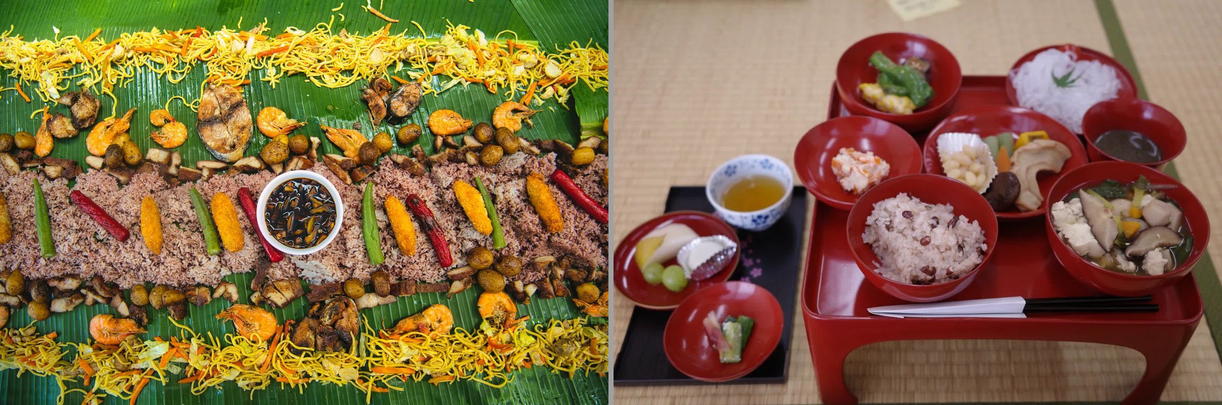 みなさんは、Boodle Fight(ブードルファイト)というフィリピンの食事スタイルをご存じでしょうか。Boodle Fight は、フィリピンの陸軍士官学校に起源を持つ食事方法の一つとされています。バナナの葉をテーブルいっぱいに広げ、その上に肉や魚のメイン料理、ライスやフルーツなどを山のように盛り付け、皆で手づかみで食べるのが特徴です。