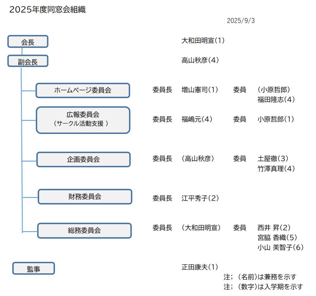 同窓会の活動は、同好会及び同期会活動への支援と同窓会主催企画が主な内容となります。既に5つの同好会が活動を開始しており、1期生、2期生の同期会での懇親会などが実施されていますが、同窓会として企画し主催する活動はこれから始まることになります。活動計画書で大きな目標は設定していますが、具体的な内容は、会員の皆様の要望や意見を役員会にて取り上げる中で作り上げることが可能となります。多くの会員の同窓会活動への参加を期待しておりますので、宜しくお願い致します。